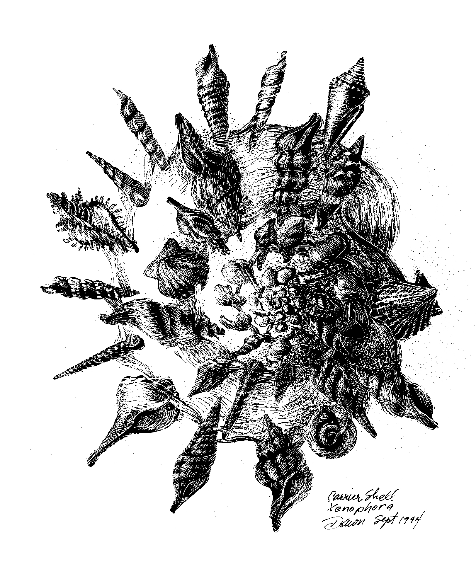 Carrier Shell, Ink on Board, 16″ x 20″, framed $1,400.00 with LA TIMES newspaper column print.